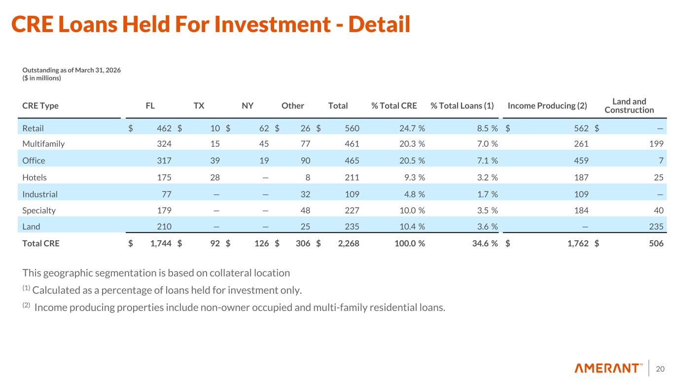 19 Loans Held for Investment Portfolio by Industry • Diversified portfolio - highest sector concentration, other than real estate, at 12% of total loans • 72% of total loans secured by real estate • Main concentrations: – CRE or Commercial Real Estate – Wholesale - Food & Auto and computer parts wholesalers – Retail - Gas stations – Services – Healthcare and Restaurants Highlights (1) Consists primarily of finance facilities granted to non-bank financial companies 5.2% which is composed mainly of 2.2% CRE note-on-note financing, 2.0% corporate finance and 0.8% mortgage warehousing lines (2) Comprised mostly of construction and real estate related services and equipment rental and leasing activities. (3) Food wholesalers represented approximately 33%. (4) Gasoline stations represented approximately 36%. (5) Healthcare represented approximately 51%. (6) Restaurants and food services represented 65%. (7) Primarily loans belonging to industrial sectors not included in the above sectors, which do not individually represent more than 1 percent of the total loan portfolio, and residential and other consumer loans which represented approximately 24% of total loans. ($ in millions) Real Estate Non-Real Estate Total % Total Loans Financial Sector (1) $ 10 $ 310 $ 320 4.9 % Construction and Real Estate & Leasing: Commercial real estate loans 2,268 — 2,268 34.6 % Other real estate related services and equipment leasing (2) 163 93 256 3.9 % Total construction and real estate & leasing 2,431 93 2,524 38.5 % Manufacturing: Foodstuffs, Apparel 57 43 100 1.5 % Metals, Computer, Transportation and Other 27 57 84 1.3 % Chemicals, Oil, Plastics, Cement and Wood/Paper 23 — 23 0.3 % Total Manufacturing 107 100 207 3.2 % Wholesale (3) 82 225 307 4.7 % Retail Trade (4) 190 155 345 5.2 % Services: Non-Financial Public Sector — 17 17 0.3 % Communication, Transportation, Health and Other (5) 123 208 331 5.0 % Accommodation, Restaurants, Entertainment and other services (6) 104 224 328 5.0 % Electricity, Gas, Water, Supply and Sewage Services 3 77 80 1.2 % Total Services 230 526 756 11.5 % Primary Products: Agriculture, Livestock, Fishing and Forestry 1 3 4 — % Mining — 7 7 0.1 % Total Primary Products 1 10 11 0.1 % Other Loans (7) 1,689 404 2,093 31.9 % Total Loans $ 4,740 $ 1,823 $ 6,563 100.0 % March 31, 2026