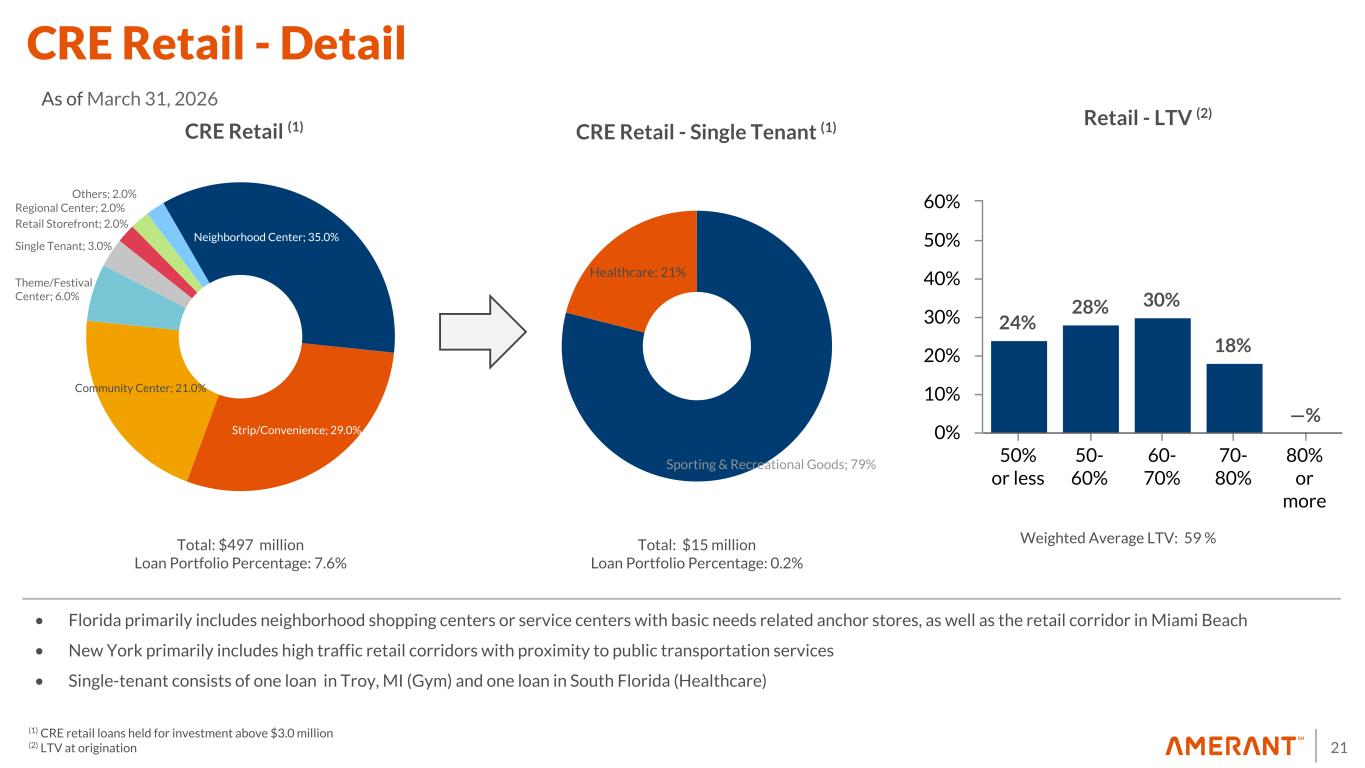20 CRE Type FL TX NY Other Total % Total CRE % Total Loans (1) Income Producing (2) Land and Construction Retail $ 462 $ 10 $ 62 $ 26 $ 560 24.7 % 8.5 % $ 562 $ — Multifamily 324 15 45 77 461 20.3 % 7.0 % 261 199 Office 317 39 19 90 465 20.5 % 7.1 % 459 7 Hotels 175 28 — 8 211 9.3 % 3.2 % 187 25 Industrial 77 — — 32 109 4.8 % 1.7 % 109 — Specialty 179 — — 48 227 10.0 % 3.5 % 184 40 Land 210 — — 25 235 10.4 % 3.6 % — 235 Total CRE $ 1,744 $ 92 $ 126 $ 306 $ 2,268 100.0 % 34.6 % $ 1,762 $ 506 Outstanding as of March 31, 2026 ($ in millions) This geographic segmentation is based on collateral location (1) Calculated as a percentage of loans held for investment only. (2) Income producing properties include non-owner occupied and multi-family residential loans. CRE Loans Held For Investment - Detail