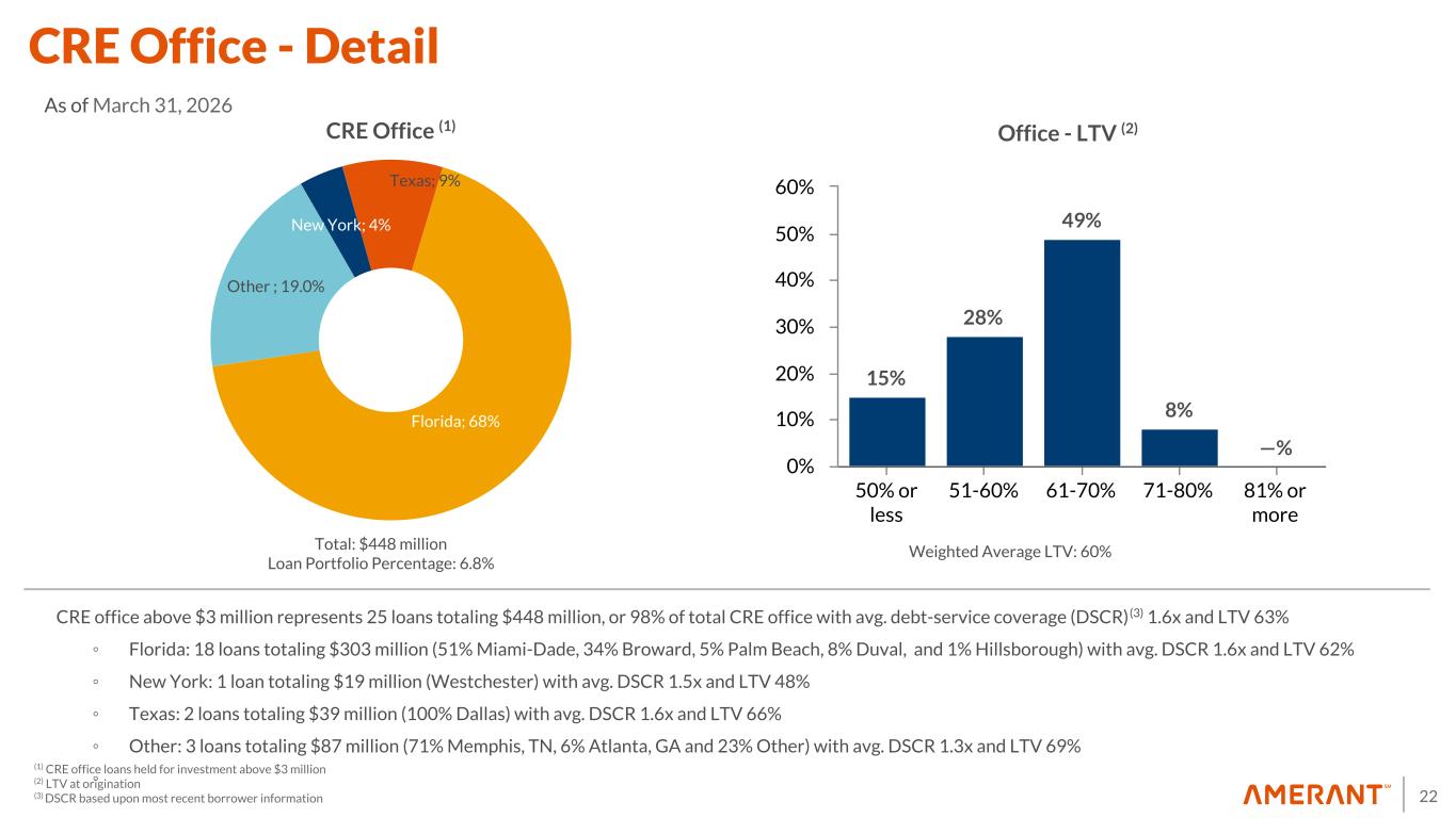21 24% 28% 30% 18% —% 50% or less 50- 60% 60- 70% 70- 80% 80% or more 0% 10% 20% 30% 40% 50% 60% • Florida primarily includes neighborhood shopping centers or service centers with basic needs related anchor stores, as well as the retail corridor in Miami Beach • New York primarily includes high traffic retail corridors with proximity to public transportation services • Single-tenant consists of one loan in Troy, MI (Gym) and one loan in South Florida (Healthcare) CRE Retail (1) Retail - LTV (2) Sporting & Recreational Goods; 79% Healthcare; 21% CRE Retail - Single Tenant (1) (1) CRE retail loans held for investment above $3.0 million (2) LTV at origination Total: $497 million Loan Portfolio Percentage: 7.6% Total: $15 million Loan Portfolio Percentage: 0.2% Neighborhood Center; 35.0% Strip/Convenience; 29.0% Community Center; 21.0% Theme/Festival Center; 6.0% Single Tenant; 3.0% Retail Storefront; 2.0% Regional Center; 2.0% Others; 2.0% CRE Retail - Detail As of March 31, 2026 Weighted Average LTV: 59 %