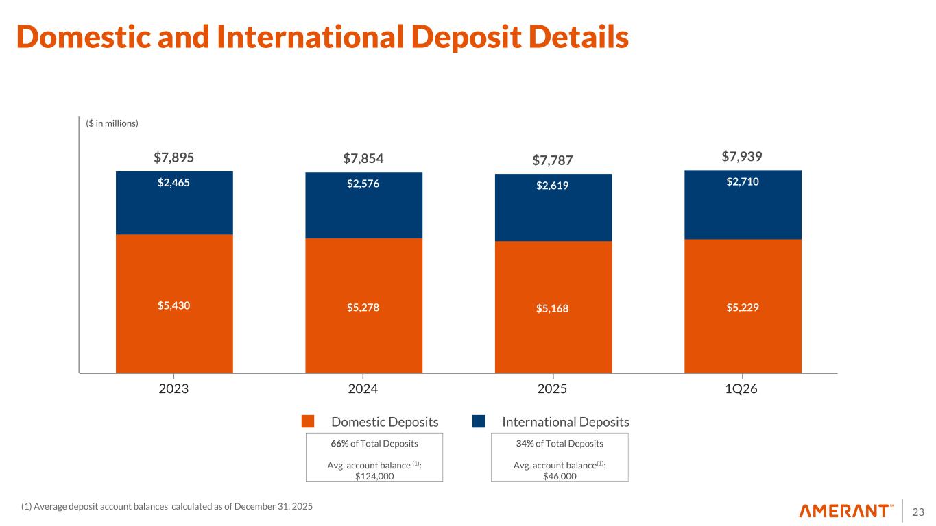 23 $7,895 $7,854 $7,787 $7,939 $5,430 $5,278 $5,168 $5,229 $2,465 $2,576 $2,619 $2,710 Domestic Deposits International Deposits 2023 2024 2025 1Q26 ($ in millions) 34% of Total Deposits Avg. account balance(1): $46,000 66% of Total Deposits Avg. account balance (1): $124,000 Domestic and International Deposit Details (1) Average deposit account balances calculated as of December 31, 2025