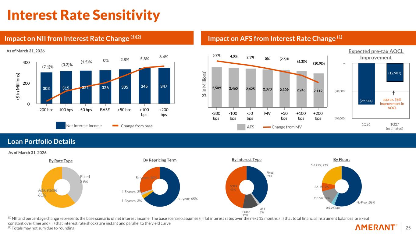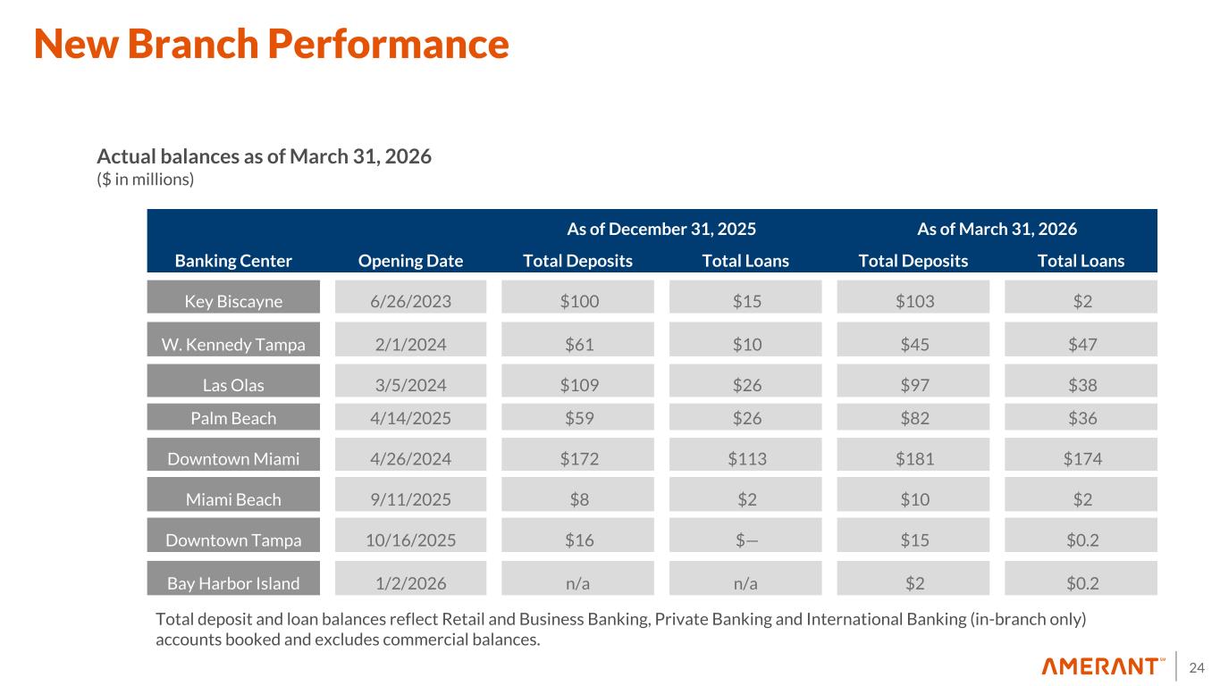 24 New Branch Performance Actual balances as of March 31, 2026 ($ in millions) Total deposit and loan balances reflect Retail and Business Banking, Private Banking and International Banking (in-branch only) accounts booked and excludes commercial balances. As of December 31, 2025 As of March 31, 2026 Banking Center Opening Date Total Deposits Total Loans Total Deposits Total Loans Key Biscayne 6/26/2023 $100 $15 $103 $2 W. Kennedy Tampa 2/1/2024 $61 $10 $45 $47 Las Olas 3/5/2024 $109 $26 $97 $38 Palm Beach 4/14/2025 $59 $26 $82 $36 Downtown Miami 4/26/2024 $172 $113 $181 $174 Miami Beach 9/11/2025 $8 $2 $10 $2 Downtown Tampa 10/16/2025 $16 $— $15 $0.2 Bay Harbor Island 1/2/2026 n/a n/a $2 $0.2