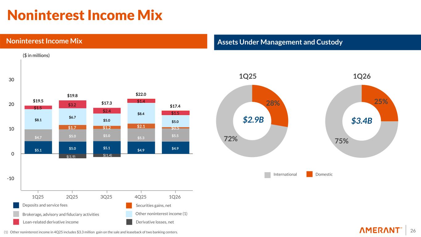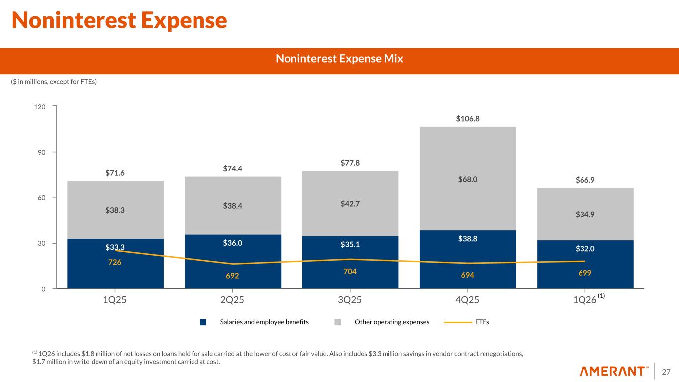 26 $19.5 $19.8 $17.3 $22.0 $17.4 $5.1 $5.0 $5.1 $4.9 $4.9 $4.7 $5.0 $5.0 $5.3 $5.5 $1.7 $1.2 $2.1 $0.5 $8.1 $6.7 $5.0 $8.4 $5.0 $1.5 $3.2 $2.4 $1.4 $1.5 1Q25 2Q25 3Q25 4Q25 1Q26 -10 0 10 20 30 28% 72% 25% 75% Noninterest Income Mix Deposits and service fees Brokerage, advisory and fiduciary activities Other noninterest income (1) DomesticInternational 1Q25 $3.4B ($ in millions) Securities gains, net Loan-related derivative income Derivative losses, net Noninterest Income Mix $2.9B Assets Under Management and Custody 1Q26 $(0.2) (1) Other noninterest income in 4Q25 includes $3.3 million gain on the sale and leaseback of two banking centers. $(1.4)$(1.9)