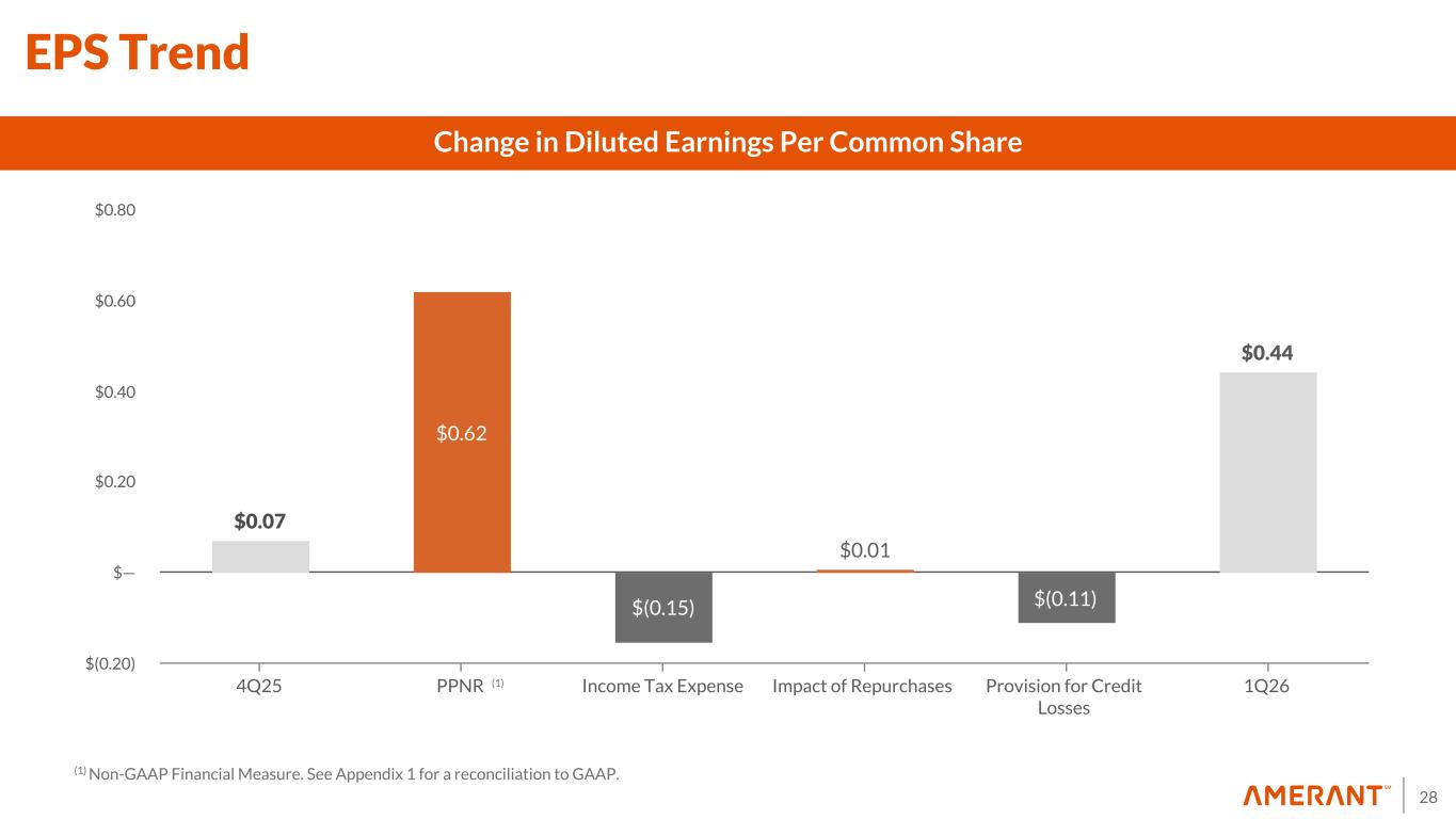 27 $71.6 $74.4 $77.8 $106.8 $66.9 $33.3 $36.0 $35.1 $38.8 $32.0 $38.3 $38.4 $42.7 $68.0 $34.9 726 692 704 694 699 Salaries and employee benefits Other operating expenses FTEs 1Q25 2Q25 3Q25 4Q25 1Q26 0 30 60 90 120 Noninterest Expense Mix ($ in millions, except for FTEs) Noninterest Expense (1) 1Q26 includes $1.8 million of net losses on loans held for sale carried at the lower of cost or fair value. Also includes $3.3 million savings in vendor contract renegotiations, $1.7 million in write-down of an equity investment carried at cost. (1)