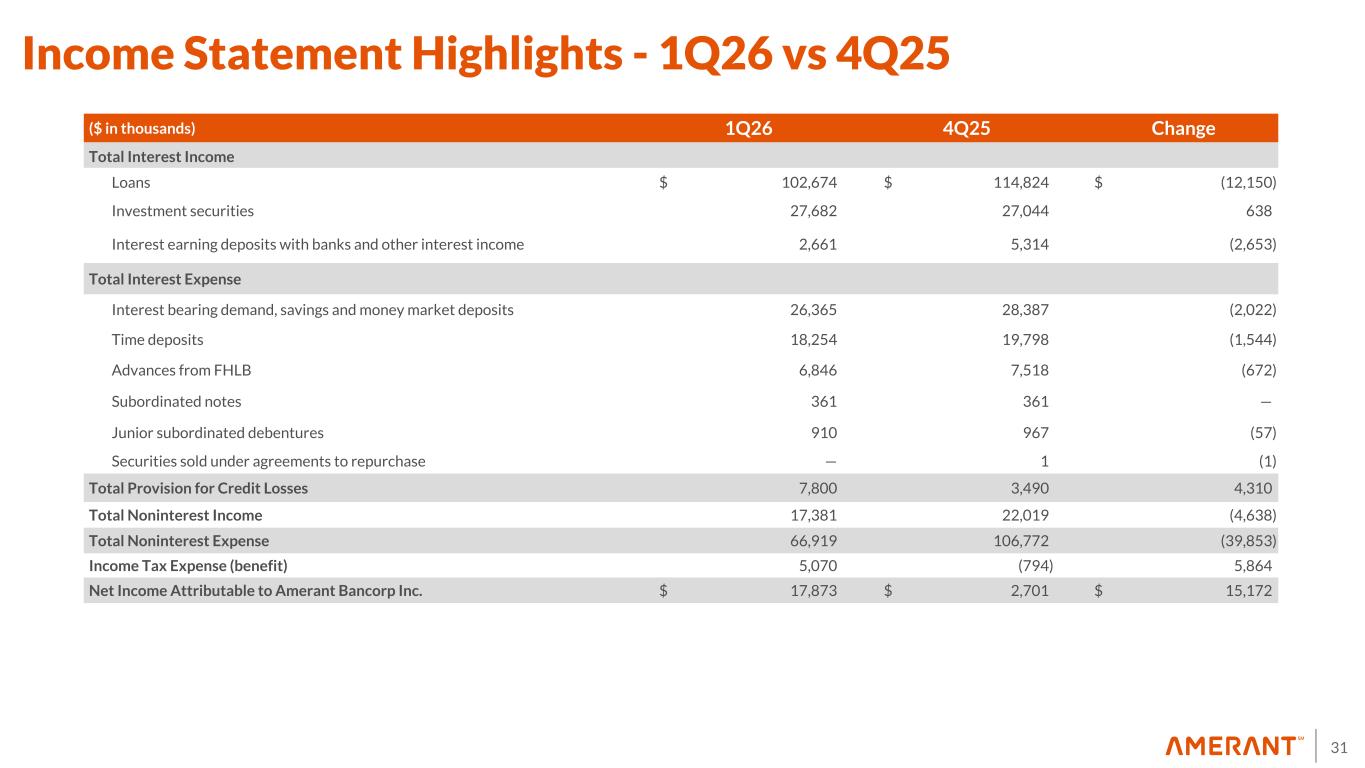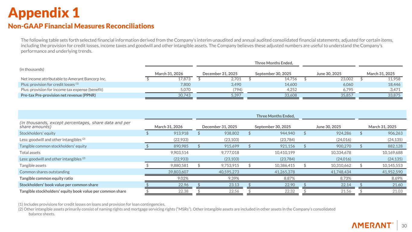 30 Appendix 1 Non-GAAP Financial Measures Reconciliations The following table sets forth selected financial information derived from the Company’s interim unaudited and annual audited consolidated financial statements, adjusted for certain items, including the provision for credit losses, income taxes and goodwill and other intangible assets. The Company believes these adjusted numbers are useful to understand the Company’s performance and underlying trends. Three Months Ended, (in thousands) March 31, 2026 December 31, 2025 September 30, 2025 June 30, 2025 March 31, 2025 Net income attributable to Amerant Bancorp Inc. $ 17,873 $ 2,701 $ 14,756 $ 23,002 $ 11,958 Plus: provision for credit losses (1) 7,800 3,490 14,600 6,060 18,446 Plus: provision for income tax expense (benefit) 5,070 (794) 4,252 6,795 3,471 Pre-tax Pre-provision net revenue (PPNR) 30,743 5,397 33,608 35,857 33,875 Three Months Ended, (in thousands, except percentages, share data and per share amounts) March 31, 2026 December 31, 2025 September 30, 2025 June 30, 2025 March 31, 2025 Stockholders' equity $ 913,918 $ 938,802 $ 944,940 $ 924,286 $ 906,263 Less: goodwill and other intangibles (2) (22,933) (23,103) (23,784) (24,016) (24,135) Tangible common stockholders' equity $ 890,985 $ 915,699 $ 921,156 $ 900,270 $ 882,128 Total assets 9,903,514 9,777,018 10,410,199 10,334,678 10,169,688 Less: goodwill and other intangibles (2) (22,933) (23,103) (23,784) (24,016) (24,135) Tangible assets $ 9,880,581 $ 9,753,915 $ 10,386,415 $ 10,310,662 $ 10,145,553 Common shares outstanding 39,803,607 40,595,273 41,265,378 41,748,434 41,952,590 Tangible common equity ratio 9.02 % 9.39 % 8.87 % 8.73 % 8.69 % Stockholders' book value per common share $ 22.96 $ 23.13 $ 22.90 $ 22.14 $ 21.60 Tangible stockholders' equity book value per common share $ 22.38 $ 22.56 $ 22.32 $ 21.56 $ 21.03 (1) Includes provisions for credit losses on loans and provision for loan contingencies. (2) Other intangible assets primarily consist of naming rights and mortgage servicing rights (“MSRs”). Other intangible assets are included in other assets in the Company’s consolidated balance sheets.