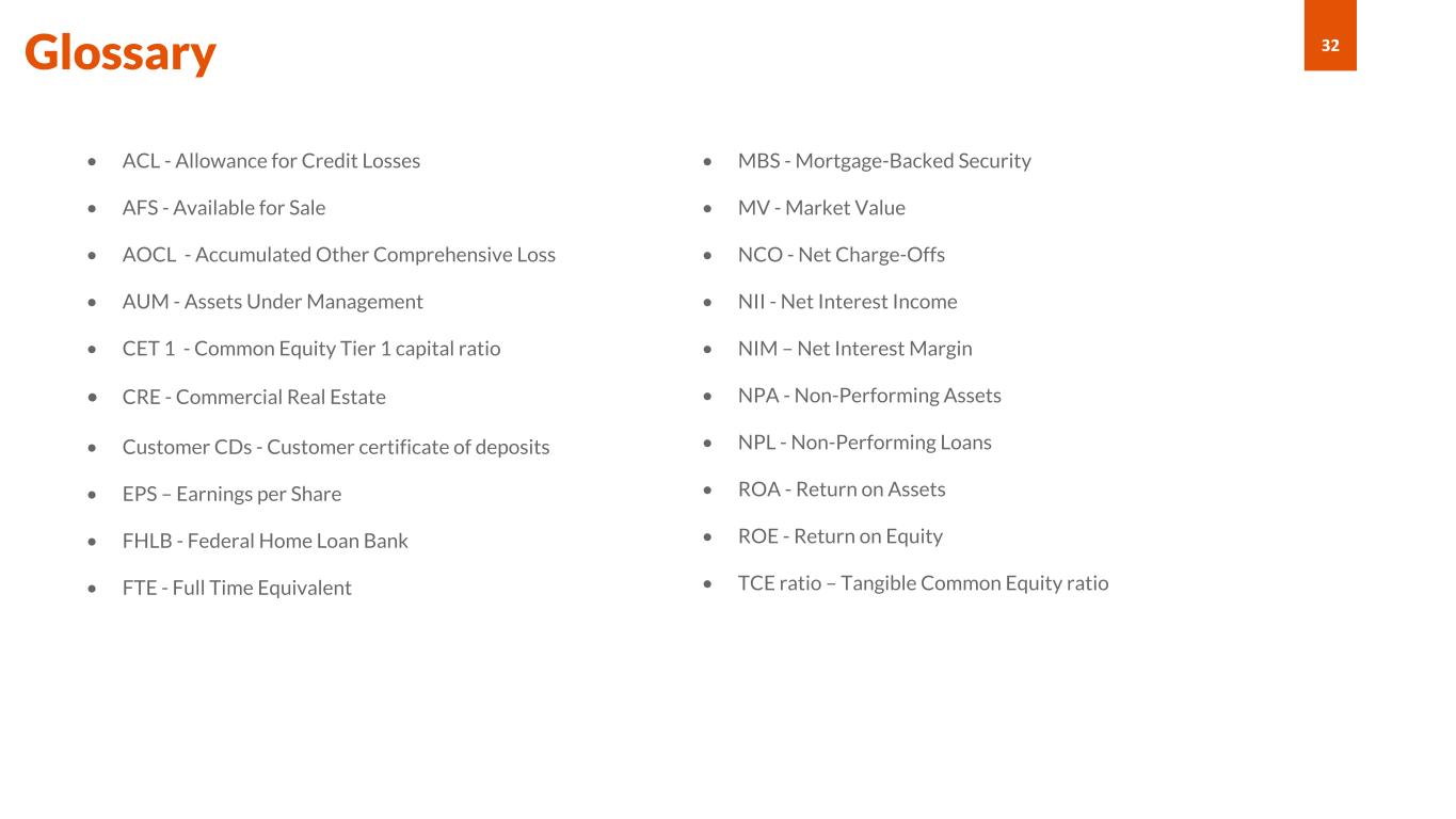 32 • ACL - Allowance for Credit Losses • AFS - Available for Sale • AOCL - Accumulated Other Comprehensive Loss • AUM - Assets Under Management • CET 1 - Common Equity Tier 1 capital ratio • CRE - Commercial Real Estate • Customer CDs - Customer certificate of deposits • EPS – Earnings per Share • FHLB - Federal Home Loan Bank • FTE - Full Time Equivalent Glossary • MBS - Mortgage-Backed Security • MV - Market Value • NCO - Net Charge-Offs • NII - Net Interest Income • NIM – Net Interest Margin • NPA - Non-Performing Assets • NPL - Non-Performing Loans • ROA - Return on Assets • ROE - Return on Equity • TCE ratio – Tangible Common Equity ratio