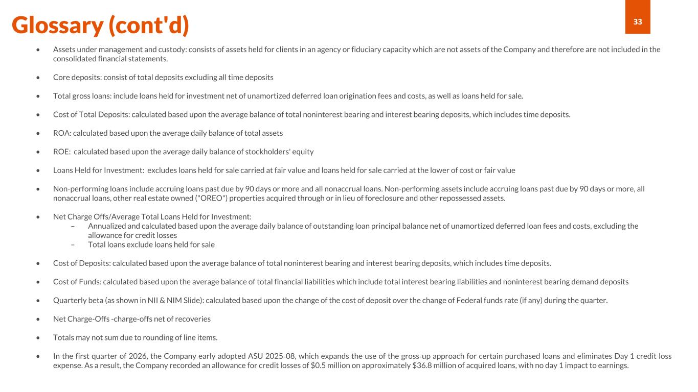 33Glossary (cont'd) • Assets under management and custody: consists of assets held for clients in an agency or fiduciary capacity which are not assets of the Company and therefore are not included in the consolidated financial statements. • Core deposits: consist of total deposits excluding all time deposits • Total gross loans: include loans held for investment net of unamortized deferred loan origination fees and costs, as well as loans held for sale. • Cost of Total Deposits: calculated based upon the average balance of total noninterest bearing and interest bearing deposits, which includes time deposits. • ROA: calculated based upon the average daily balance of total assets • ROE: calculated based upon the average daily balance of stockholders' equity • Loans Held for Investment: excludes loans held for sale carried at fair value and loans held for sale carried at the lower of cost or fair value • Non-performing loans include accruing loans past due by 90 days or more and all nonaccrual loans. Non-performing assets include accruing loans past due by 90 days or more, all nonaccrual loans, other real estate owned ("OREO") properties acquired through or in lieu of foreclosure and other repossessed assets. • Net Charge Offs/Average Total Loans Held for Investment: – Annualized and calculated based upon the average daily balance of outstanding loan principal balance net of unamortized deferred loan fees and costs, excluding the allowance for credit losses – Total loans exclude loans held for sale • Cost of Deposits: calculated based upon the average balance of total noninterest bearing and interest bearing deposits, which includes time deposits. • Cost of Funds: calculated based upon the average balance of total financial liabilities which include total interest bearing liabilities and noninterest bearing demand deposits • Quarterly beta (as shown in NII & NIM Slide): calculated based upon the change of the cost of deposit over the change of Federal funds rate (if any) during the quarter. • Net Charge-Offs -charge-offs net of recoveries • Totals may not sum due to rounding of line items. • In the first quarter of 2026, the Company early adopted ASU 2025-08, which expands the use of the gross-up approach for certain purchased loans and eliminates Day 1 credit loss expense. As a result, the Company recorded an allowance for credit losses of $0.5 million on approximately $36.8 million of acquired loans, with no day 1 impact to earnings.